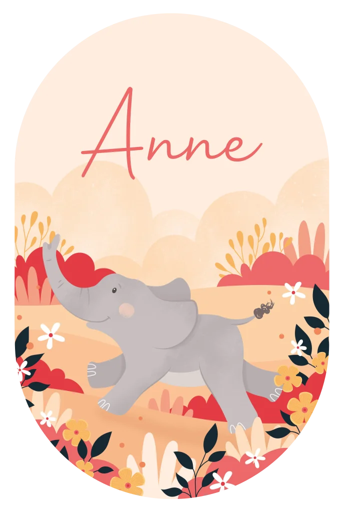 Lief en hip geboortekaartje meisje met een olifantje. Met roze, geel en oranje planten op een licht roze achtergrond. (23533)