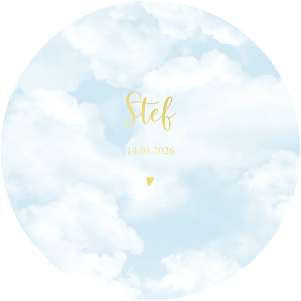 Een lief lichtblauw geboortekaartje met wolken en goudfolie. De achtergrondkleur en tekstkleur is aanpasbaar. (23250)