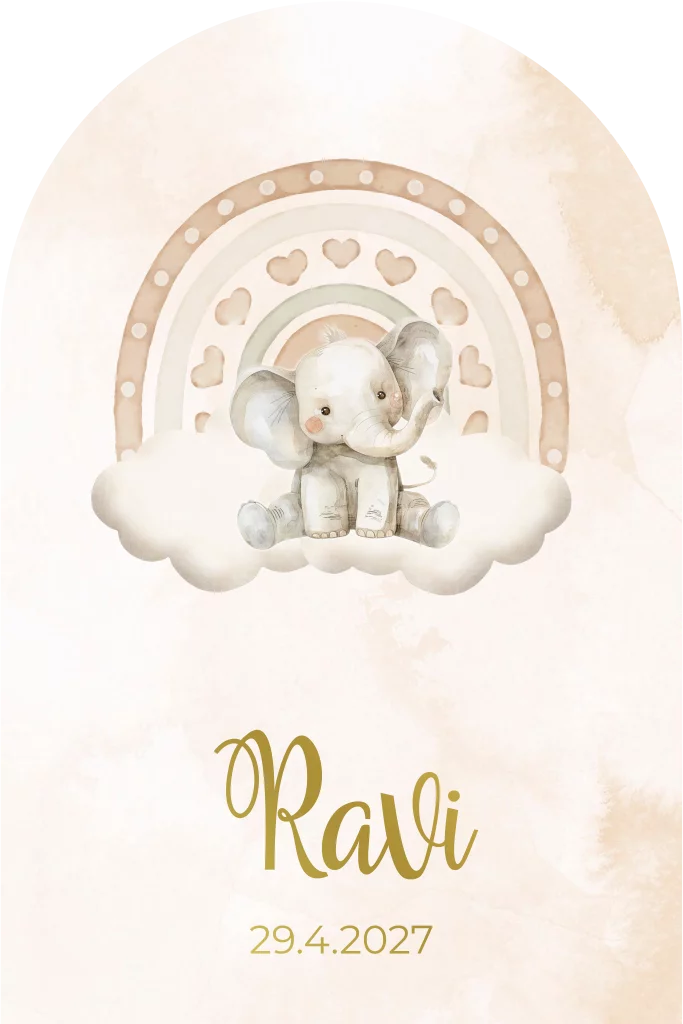 Geboortekaartje voor een jongen of meisje in een bijzondere boogvorm met een olifantje op een wolkje bij een regenboog. In warme aardetinten. (24643)