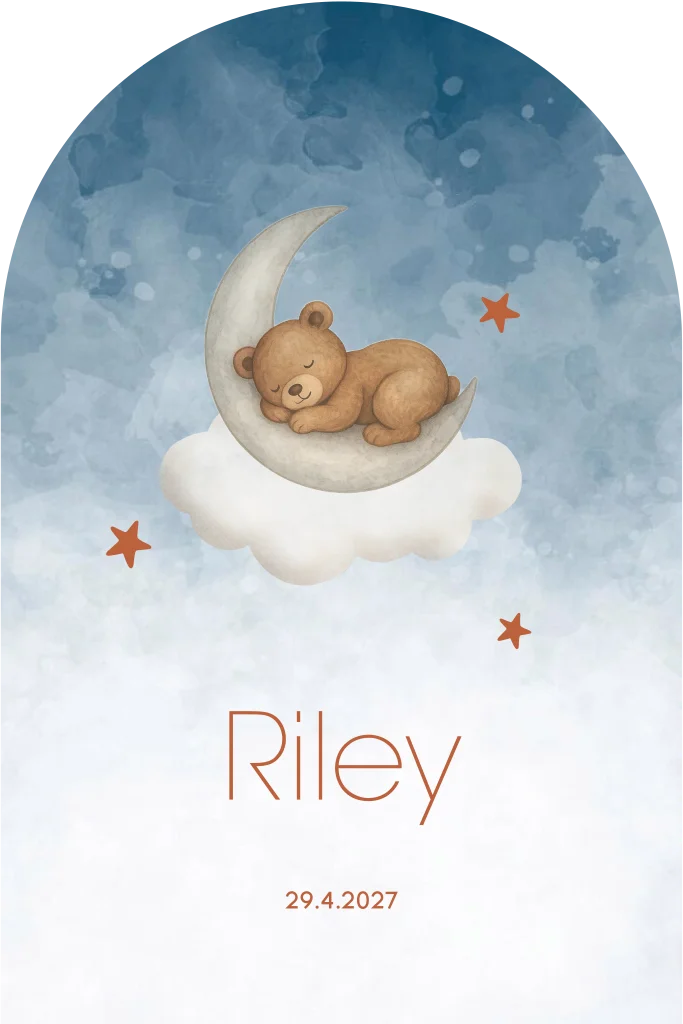 Romantisch geboortekaartje voor een jongen of meisje in een bijzondere boogvorm met een slapend beertje op de maan. (30303)