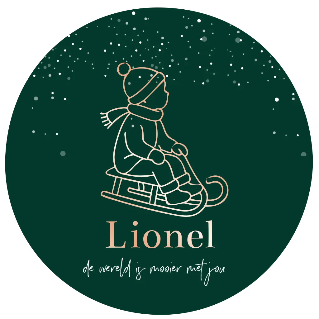 Geboortekaartje in een bijzondere ronde vorm met een silhouet van een jongen op de slee.Winters thema. (30085)