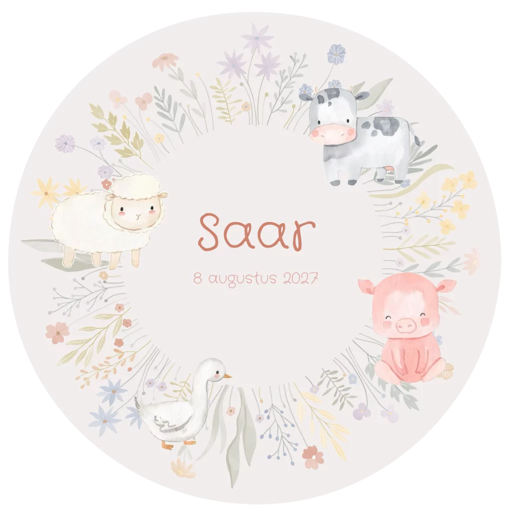 Rond boerderijdieren geboortekaartje kaartje voor een meisje met bloemen, schaapje, gansje, koe en een varkentje. (23844)