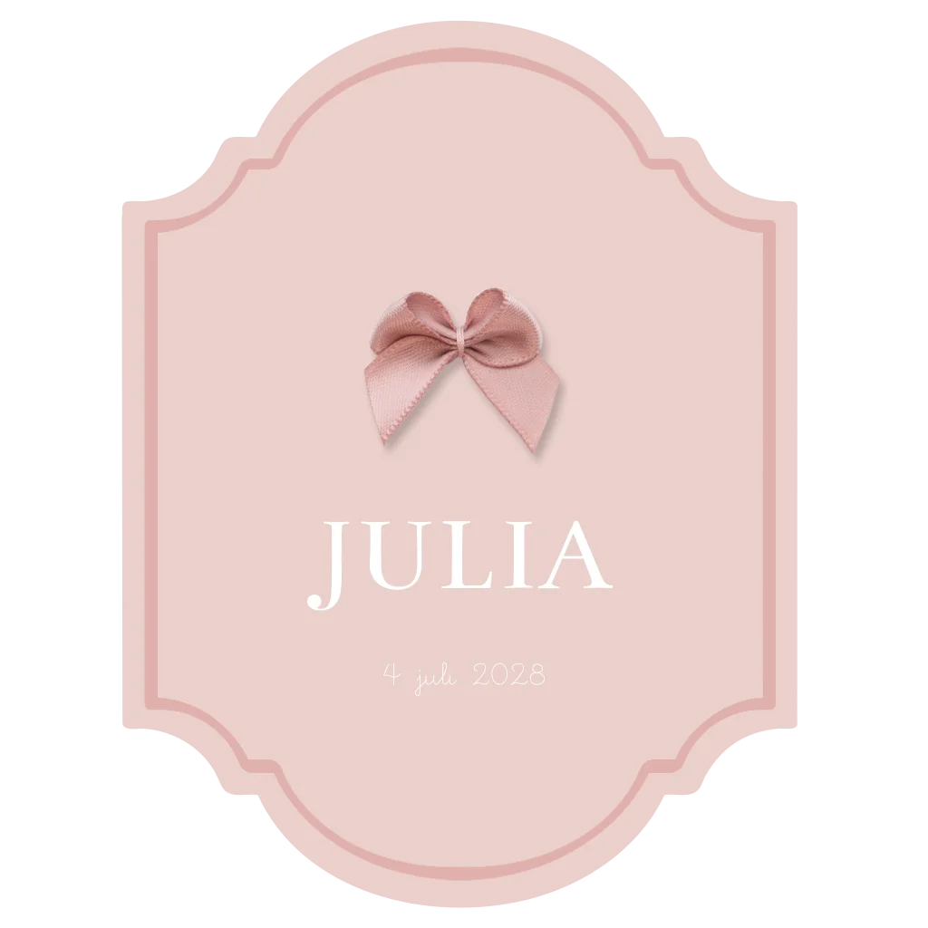 Klassiek meisjes geboortekaartje met echt oud roze strikje in een luxe label vorm gestanst. De kleuren zijn naar wens aan te passen.