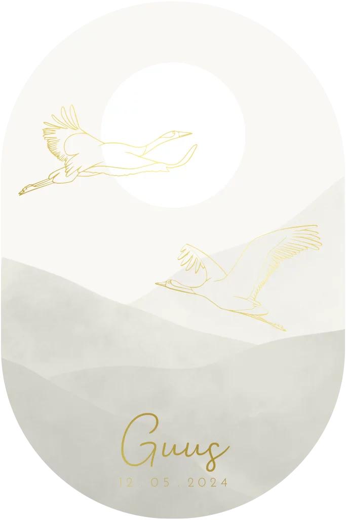 Ovaal geboortekaartje met goudfolie kraanvogels zon en bergen