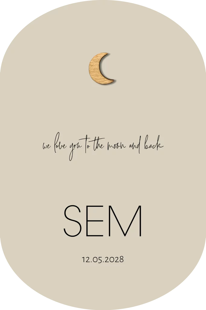 Hip gestanst ovaal geboortekaartje in de kleur beige. Voor een jongen met een echte houten maan. (23920)