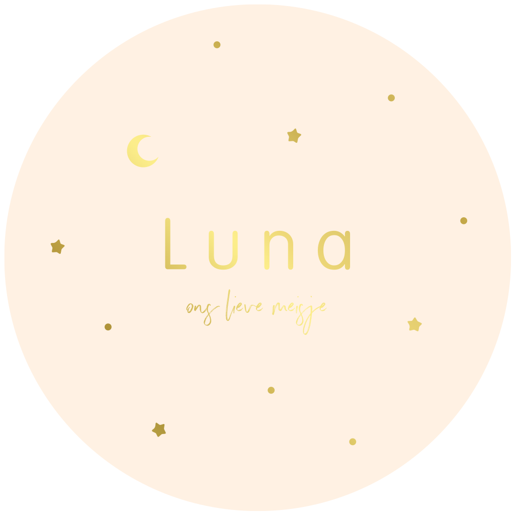 Rond geboortekaartje met goudfolie naam en maan en sterretjes. (23171)