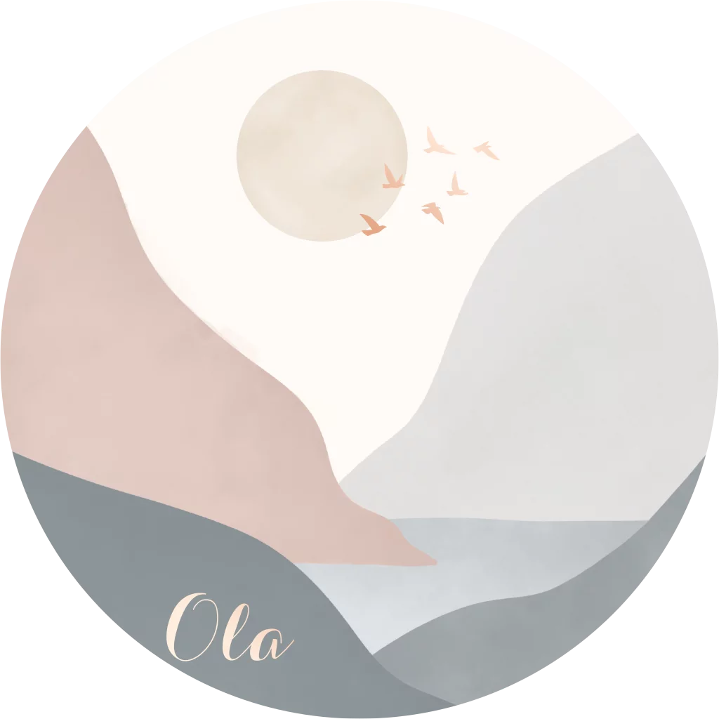 Prachtig rond geboortekaartje met bergen, vogels, zon en zee. Voor een meisje. (23175)
