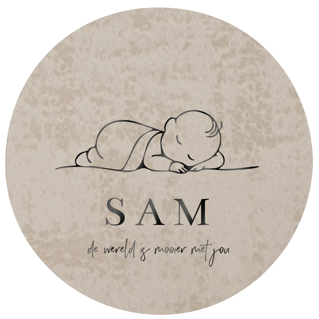 Geboortekaartje in een ronde vorm met daarop een slapende baby. De baby en voornaam staan in zwarte hoogglans spot uv lak gedrukt voor een luxe effect. De achtergrond heeft een velvet stof look in beige. Alle kleuren kunnen naar wens aangepast worden (30380)