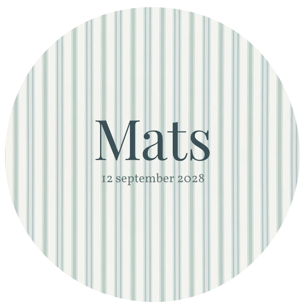 Stijlvol en klassiek rond geboortekaartje jongen met streepjes behang patroon met de kleuren groen en beige. Ronde kaarten laten drukken in 13 cm of 15 cm. Deze kaart stansen we rond uit een vierkante kaart, de vorm van de envelop is vierkant. (24754)