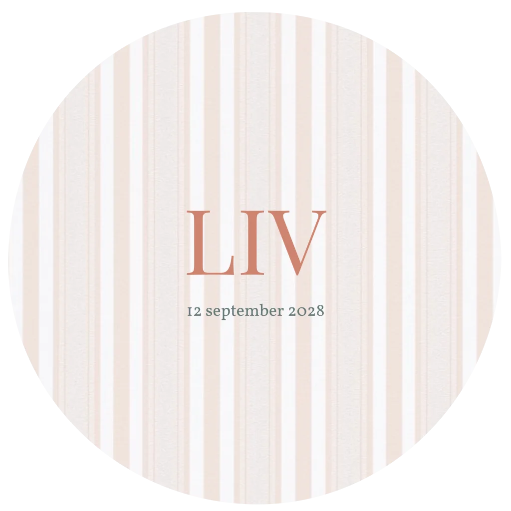 Stijlvol rond geboortekaartje meisje met streepjes behang motief met kleur terra.Ronde kaarten laten drukken in 13 cm of 15 cm. Deze kaart stansen we rond uit een vierkante kaart, de vorm van de envelop is vierkant. (24755)