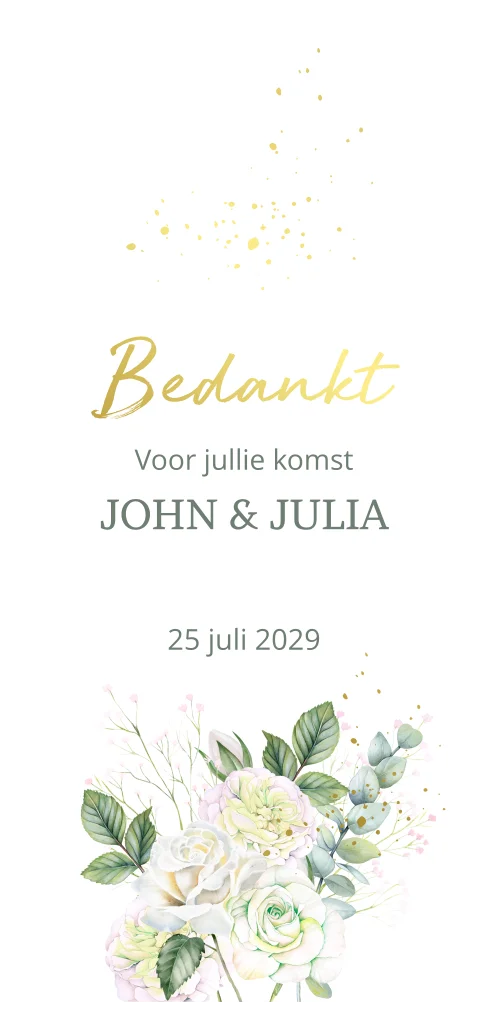 Bedankkaart met witte rozen en eucalyptus takken. Op de achterzijde van de kaart is er ruimte om een eigen foto te plaatsen. (24456)