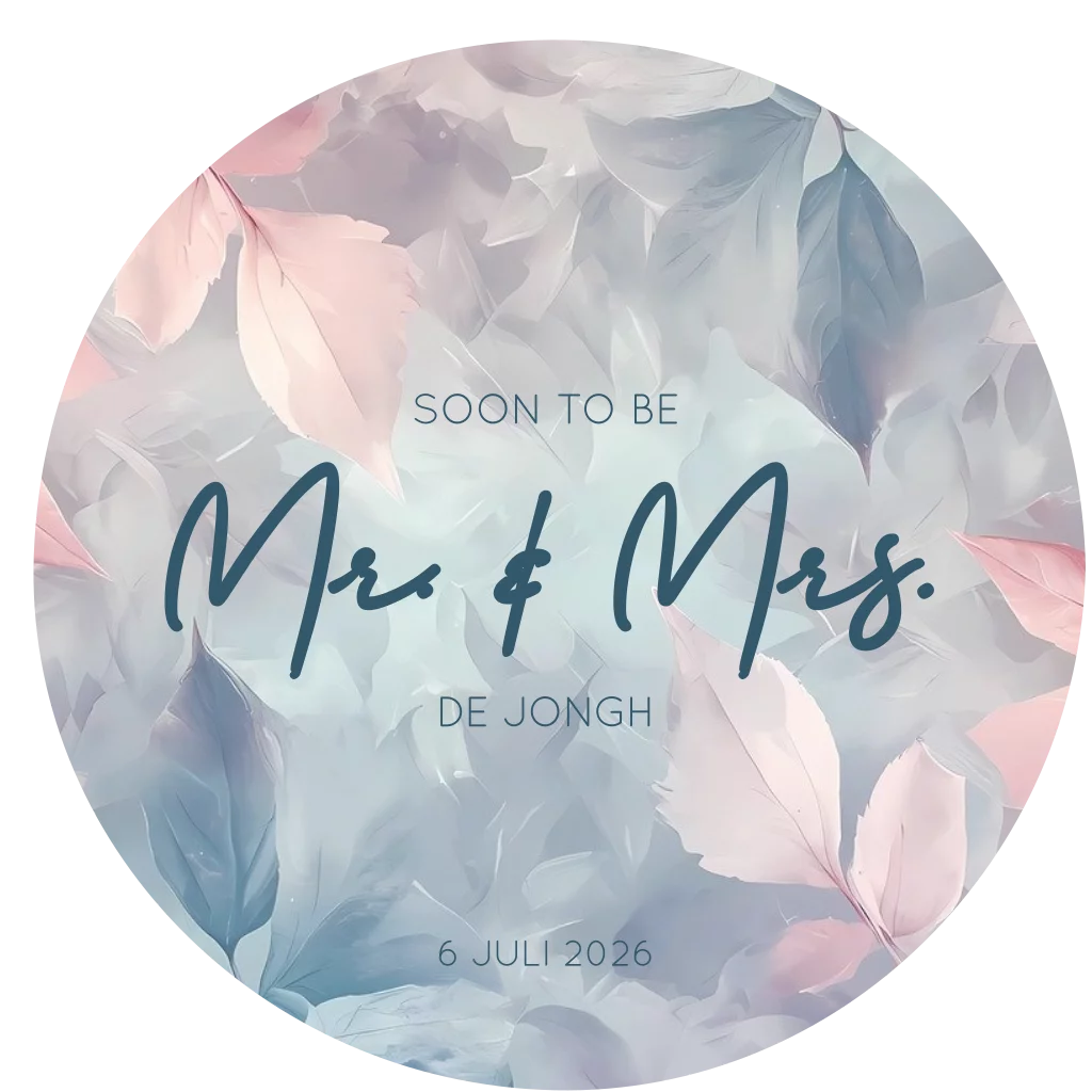 Trouwkaart in een ronde vorm gesneden met een kleurrijk ontwerp met bladeren in pastel kleuren roze en petrol. Deze kaart is ook beschikbaar als vierkante kaart. (24469)