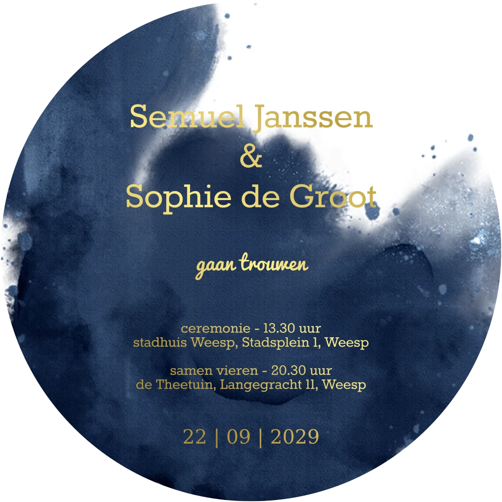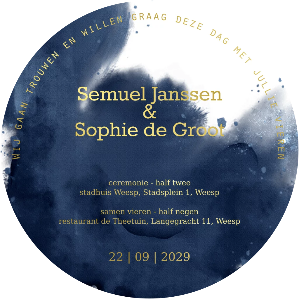 Ronde trouwkaart in vorm van een cirkel gestanst met blauwe aquarel op de achtergrond en gouden foliedruk op de voorkant.