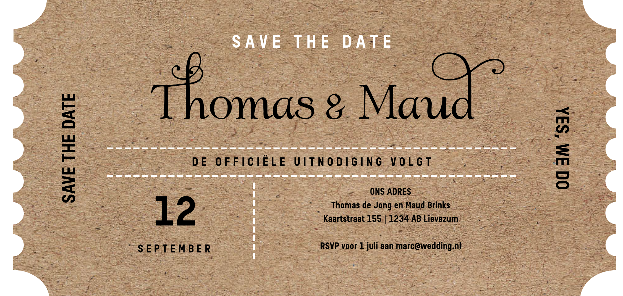 Hippe save the date uitnodiging in de echte vorm van een echte ticket gestanst met kraft look achtergrond. (23221)