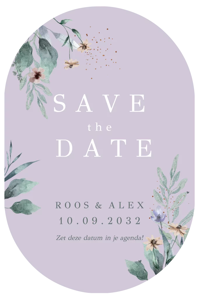 Save the Date kaart bruiloft trouwen feest in een bijzondere ovale vorm Lila met bloemen. (24441)