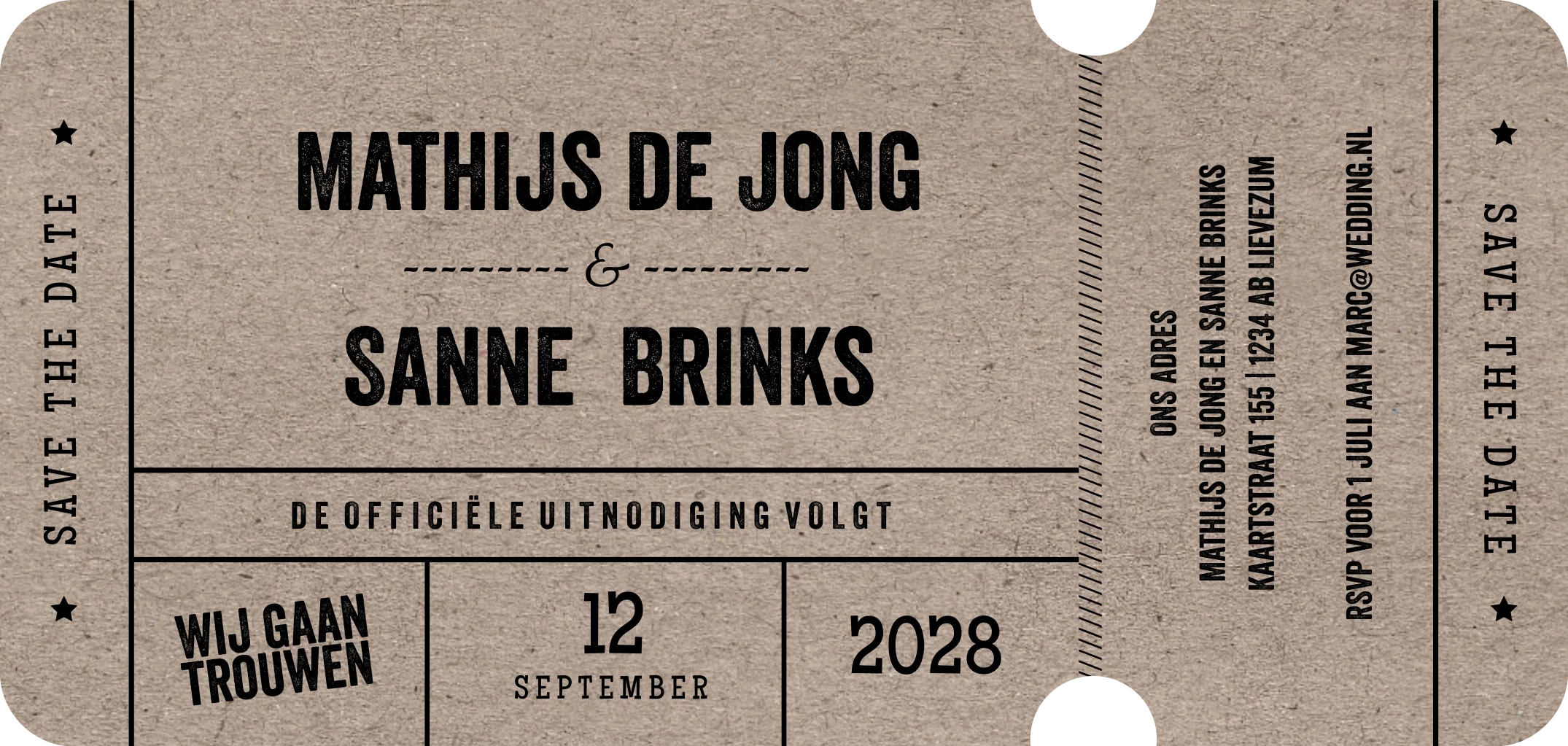 Save the date uitnodiging gestanst in ticket vorm met kraft look achtergrond. (23216)