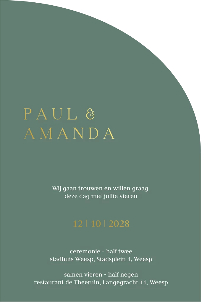 Trouwkaart modern en clean in de vorm van een halve boog met groene achtergrond en goudfoliedruk. (23156) Wedding Invitation Card Green.