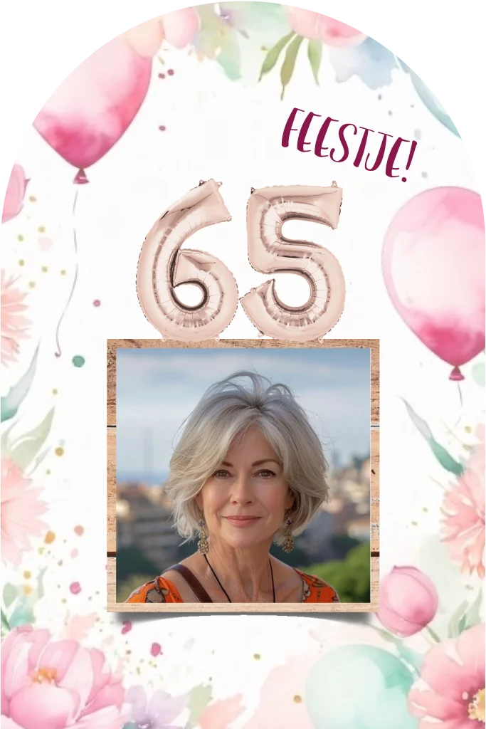Uitnodiging 65e verjaardag vrouw met ballonnen en eigen foto