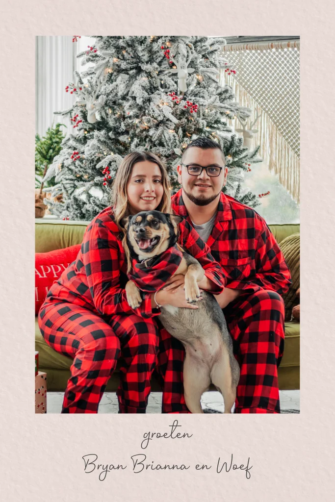 Kerstkaart in fris roze met foto aan de binnenkant die je kunt zien achter de uitgesneden klok op de voorkant. Pas zelf de kleuren en teksten naar wens aan. (30221)