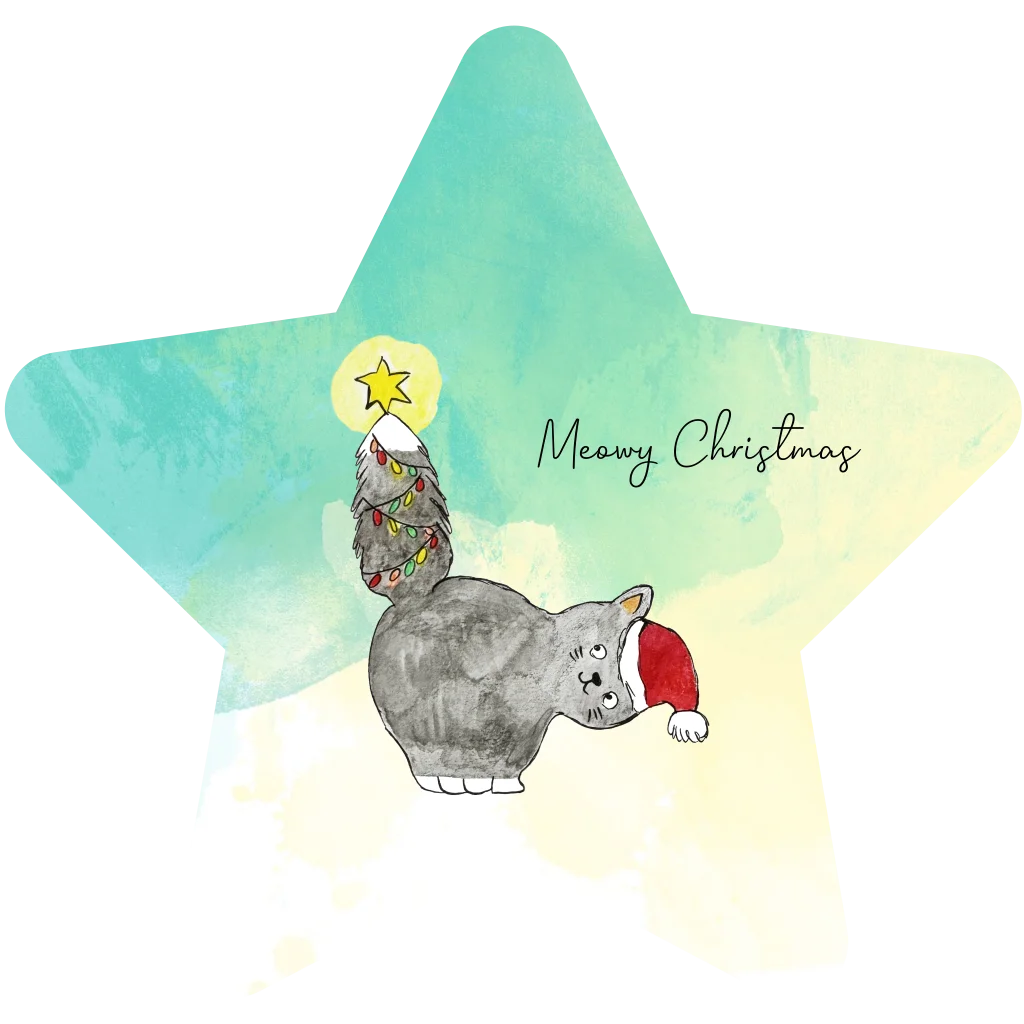 Lieve kerstkaart in stervorm met tekening van poes met kerstboom staart. Illustratie van kat met lampjes, kerstster en kerstmuts. Originele kerstkaart voor de hele familie. (24359)