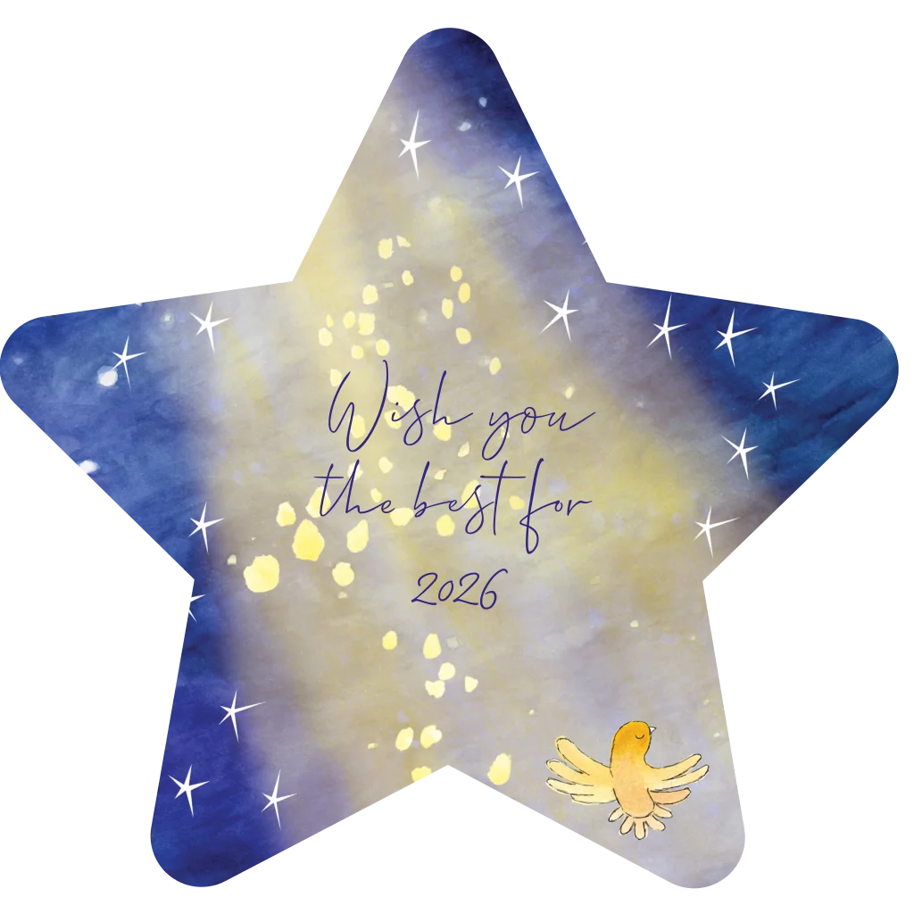 Super origineel is deze prachtige ster met lieve illustratie van kerstlicht in een sterrenhemel. Met tekening van duifjes. Lief, leuk, origineel en eigen kerstkaart voor de hele familie. De beste wensen voor 2025. (24348)