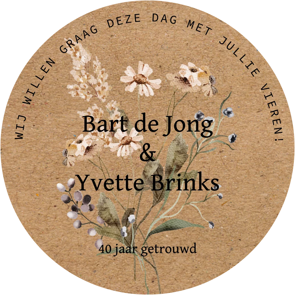 Super leuke en originele jubileum uitnodigingskaart in een bijzondere ronde vorm met kraft look print op de achtergrond. Teksten en bloemen staan los en zijn ook om te kleuren. (24103)