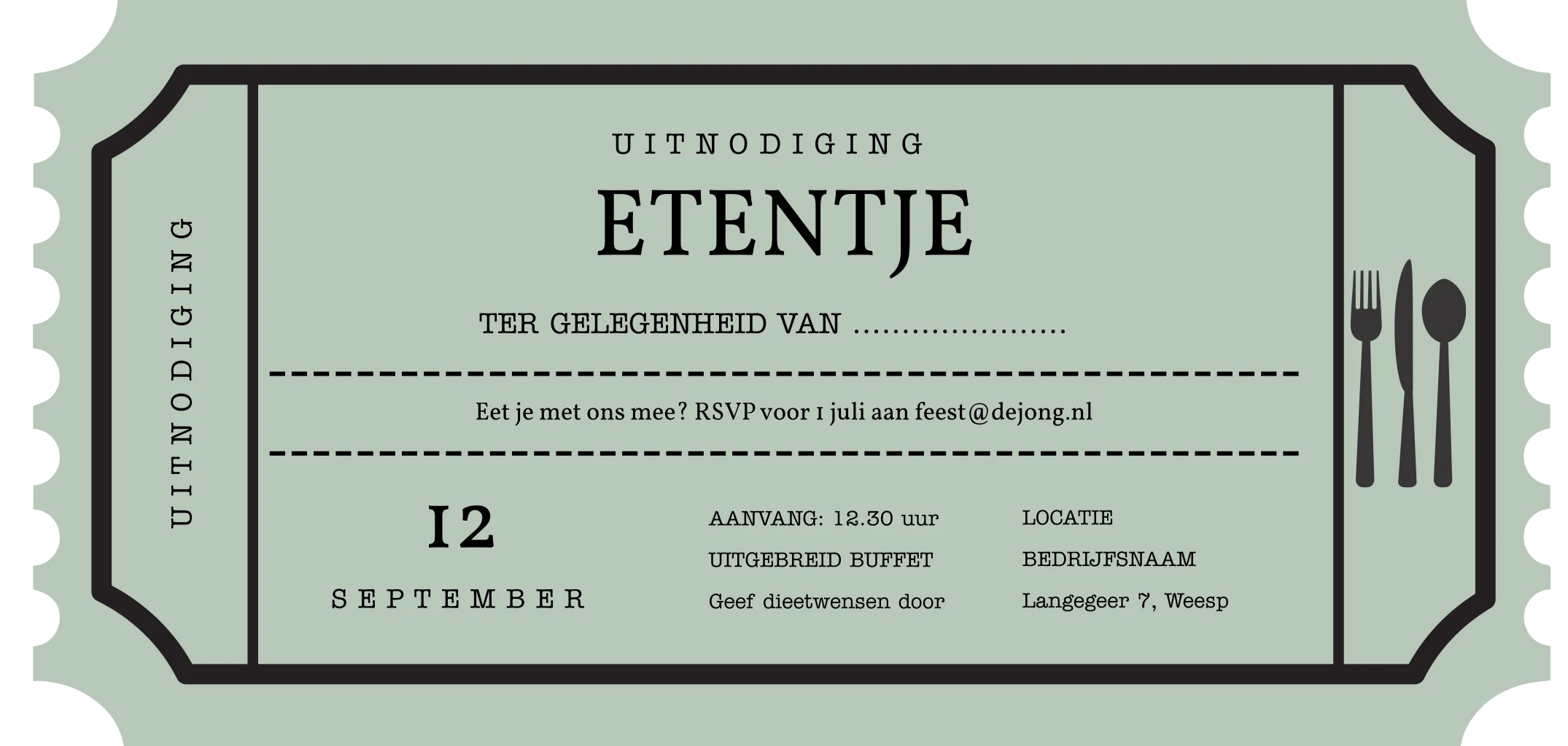 Uitnodiging etentje in de vorm van een toegangs ticket. De kleur is naar wens aan te passen (23507)