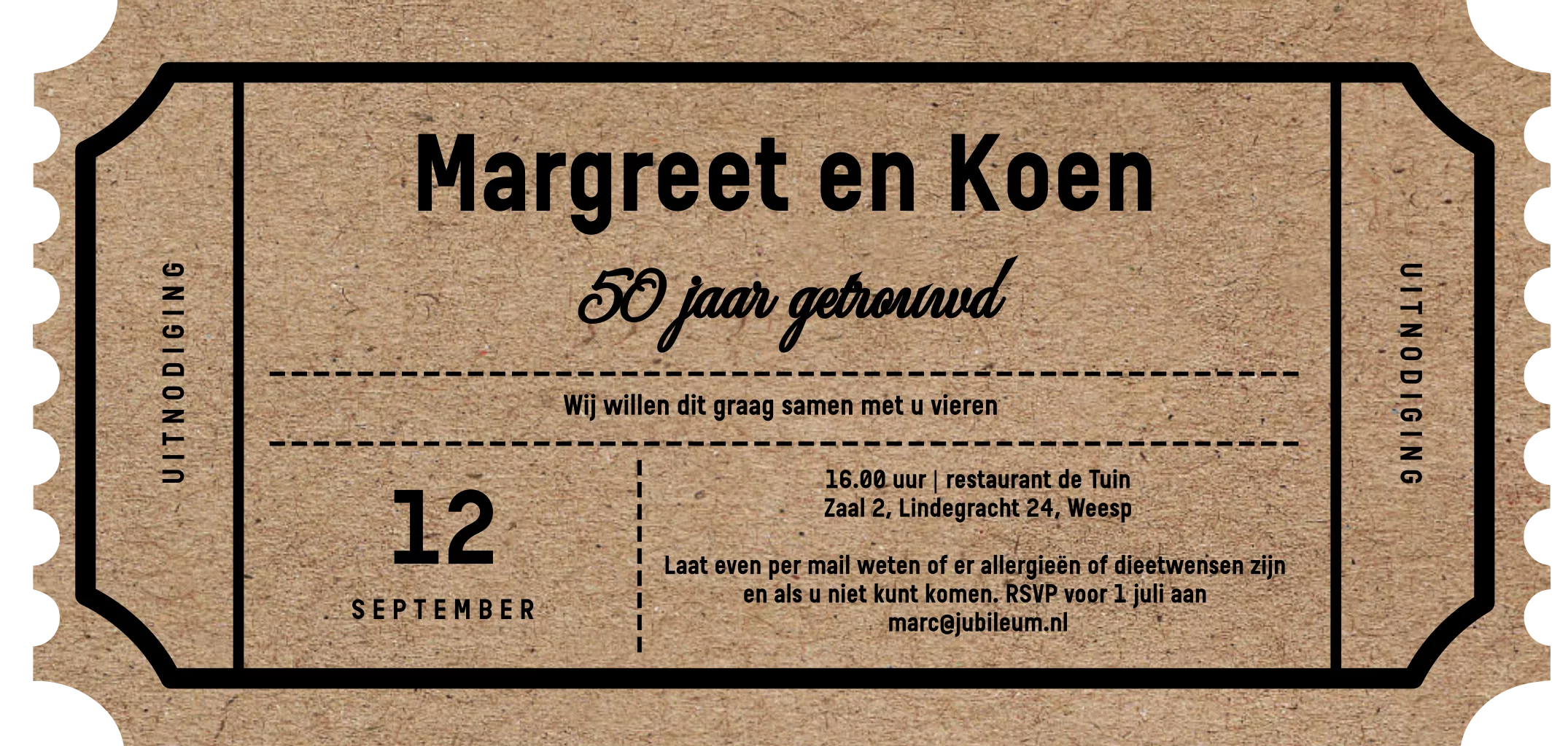 50 jaar getrouwd uitnodiging in een echte vorm van een ticket gestanst met een karton-look achtergrond en zwarte kaders. (23219)