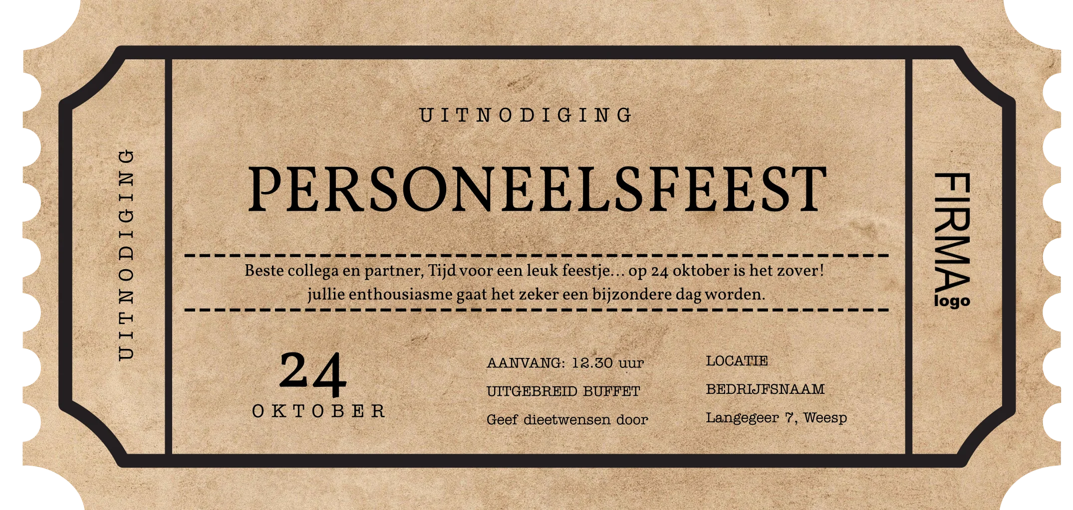 Uitnodiging personeelsfeest van een bedrijf in de vorm van een ticket. ook ruimte voor een eigen logo en aan de achterkant kan ook tekst geplaatst worden (23507)