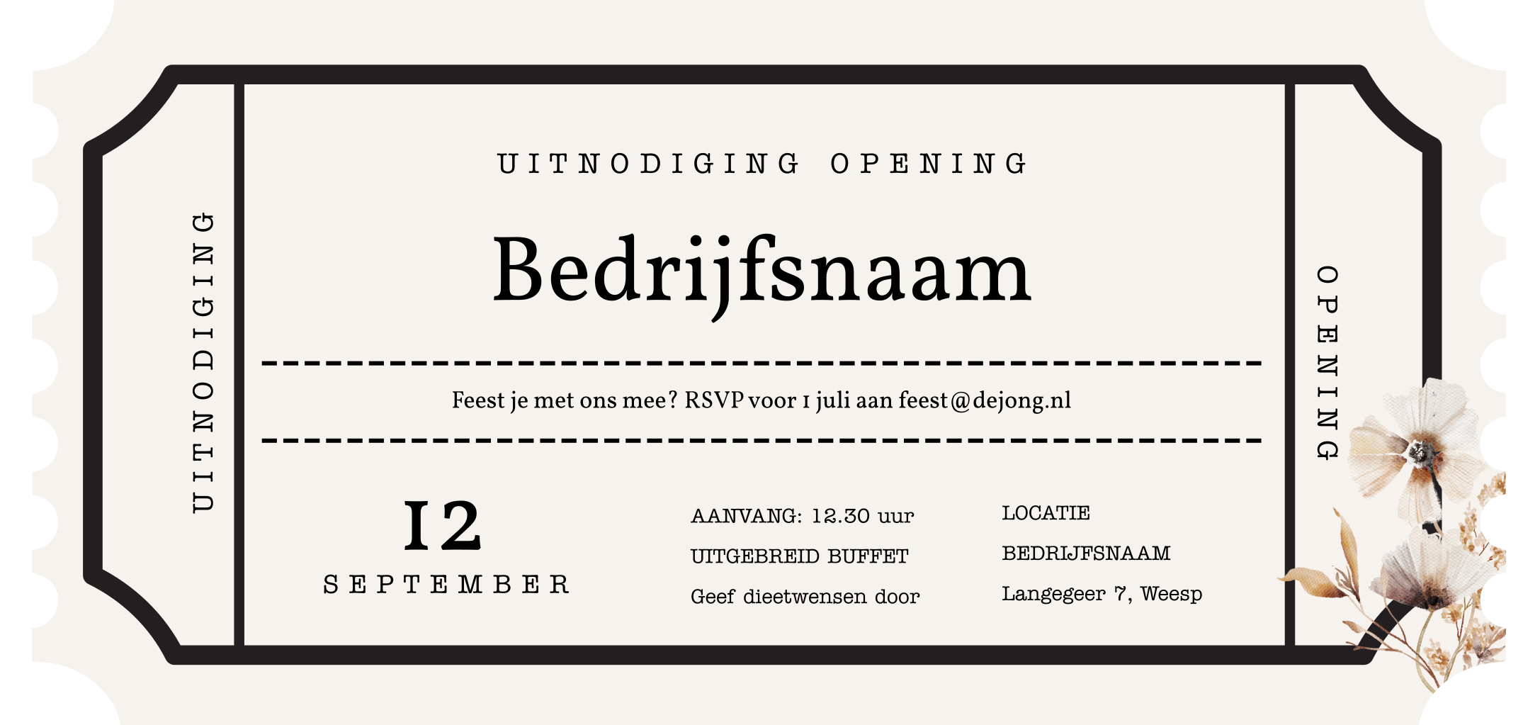 Een mooie uitnodiging kaart met bloemen en in de vorm van een ticket. Ten gebruiken voor een zakelijk feestje, bedrijf bedrijfspand opening jubileum (23507)