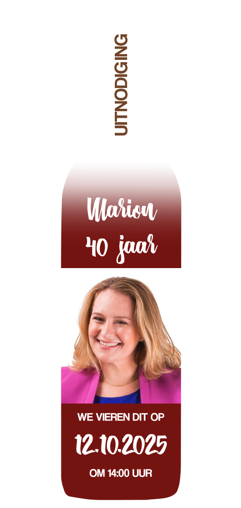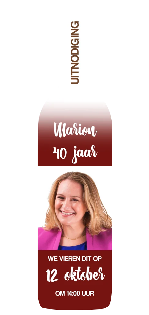 Uitnodiging verjaardag vrouw wijn wijnfles met een eigen foto als etiket. De kleur van de wijn kan naar wens aangepast worden evenals de lettertypes en tekst. (23020)