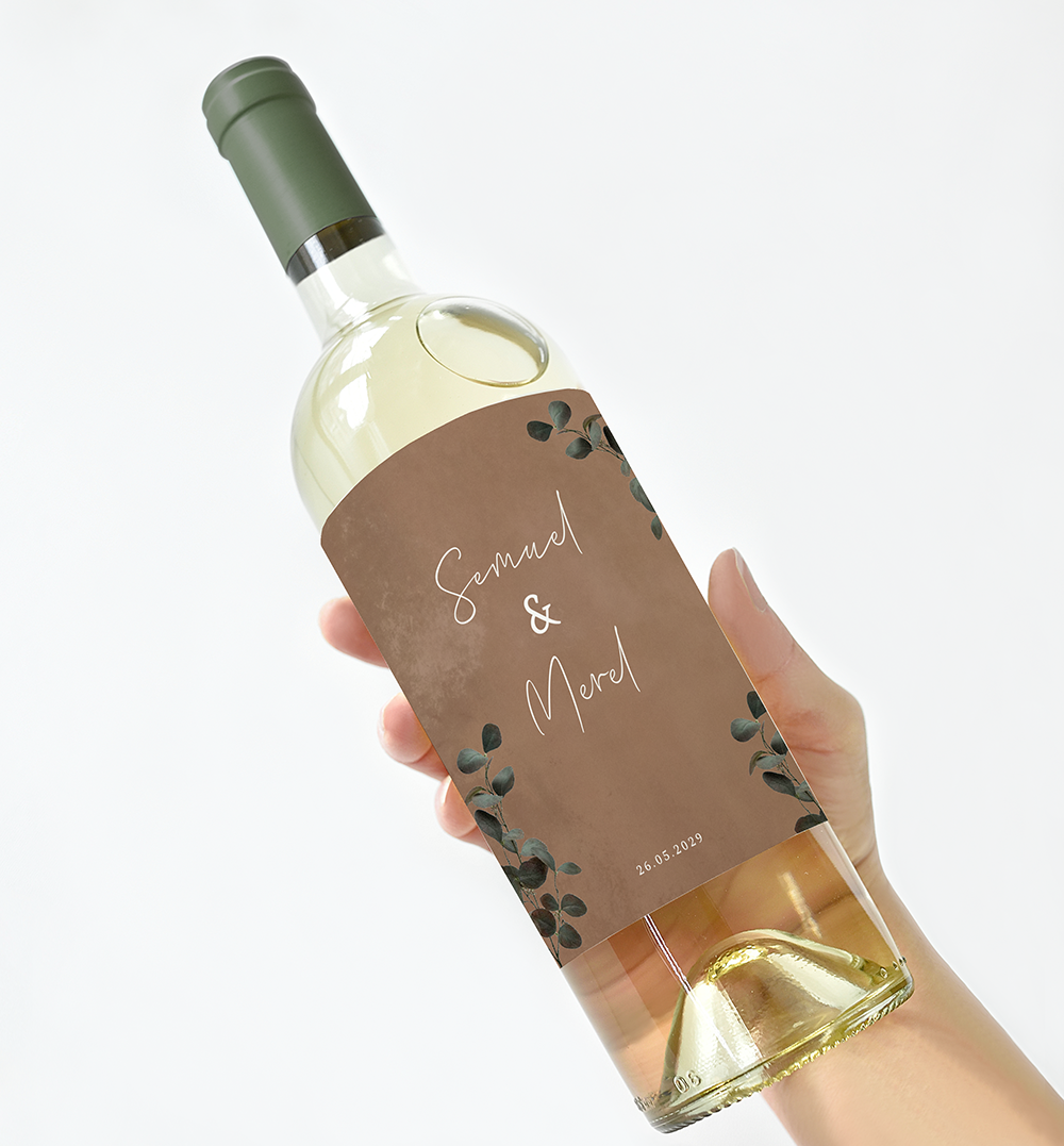 Wijnetiket met namen met eucalyptus