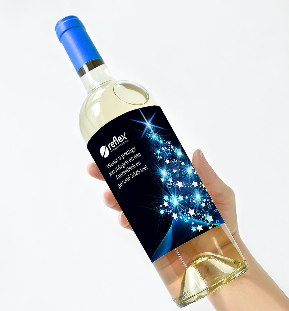Wijnfles etiket in zwart blauw voor de zakelijke markt met eigen logo. (20417).
