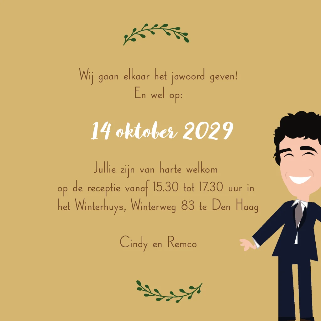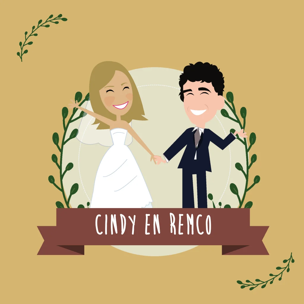 Bruidspaar is aan te passen (huidskleur, haardracht en haarkleur) (4158) Tip: Laat een (echte) tekening van jezelf plaatsen. Zo kun je jezelf en je partner al voor € 44 na laten tekenen, maar bijvoorbeeld ook je kinderen, je huisdier of je trouwlocatie. Alles is mogelijk!