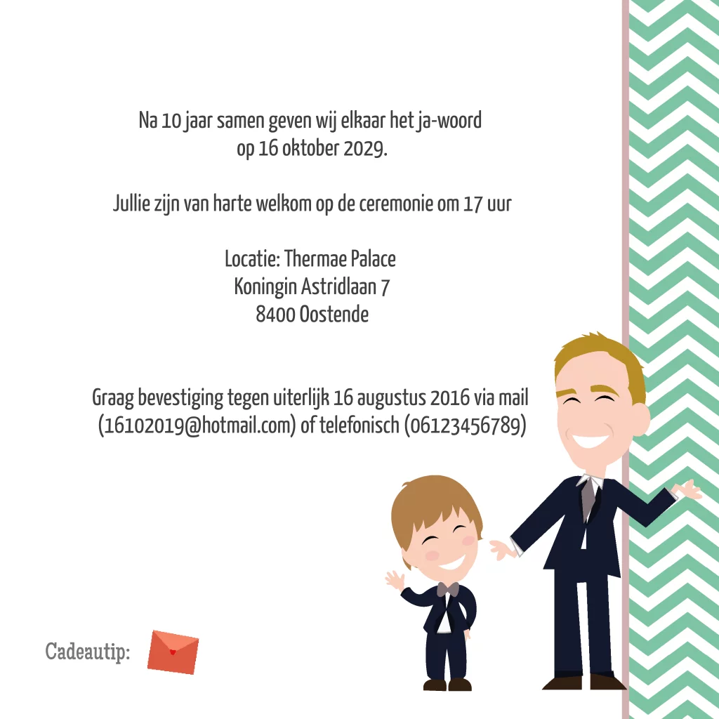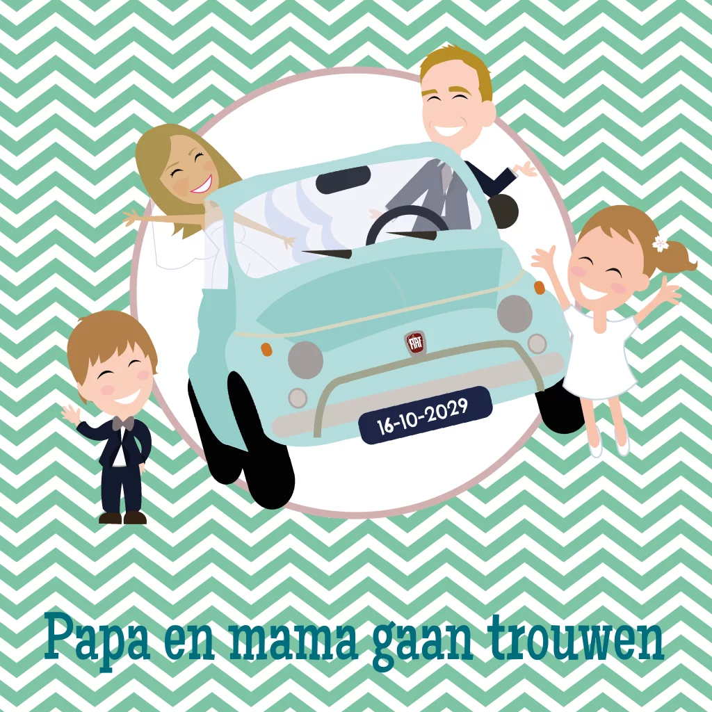 Trouwkaart groene chevron fiat 500 en eigen cartoons
