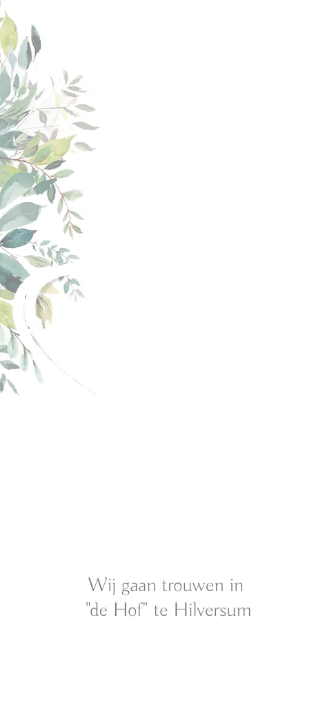 Goudfolie trouwkaart in langwerpig staand formaat van 10 cm breed en 21 cm hoog met takjes aquarel getekend. (8333)