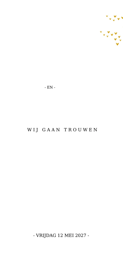 Langwerpige staande trouwkaart met hartjes in goudfolie