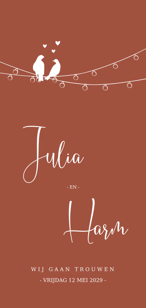 Langwerpige staande trouwkaart met vogels en lampjes. (20393)