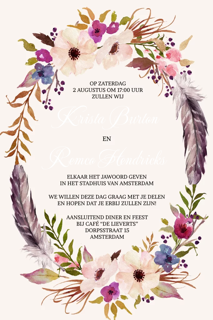 Stijlvolle trouwkaart bohemian foliedruk met bloemen en veren