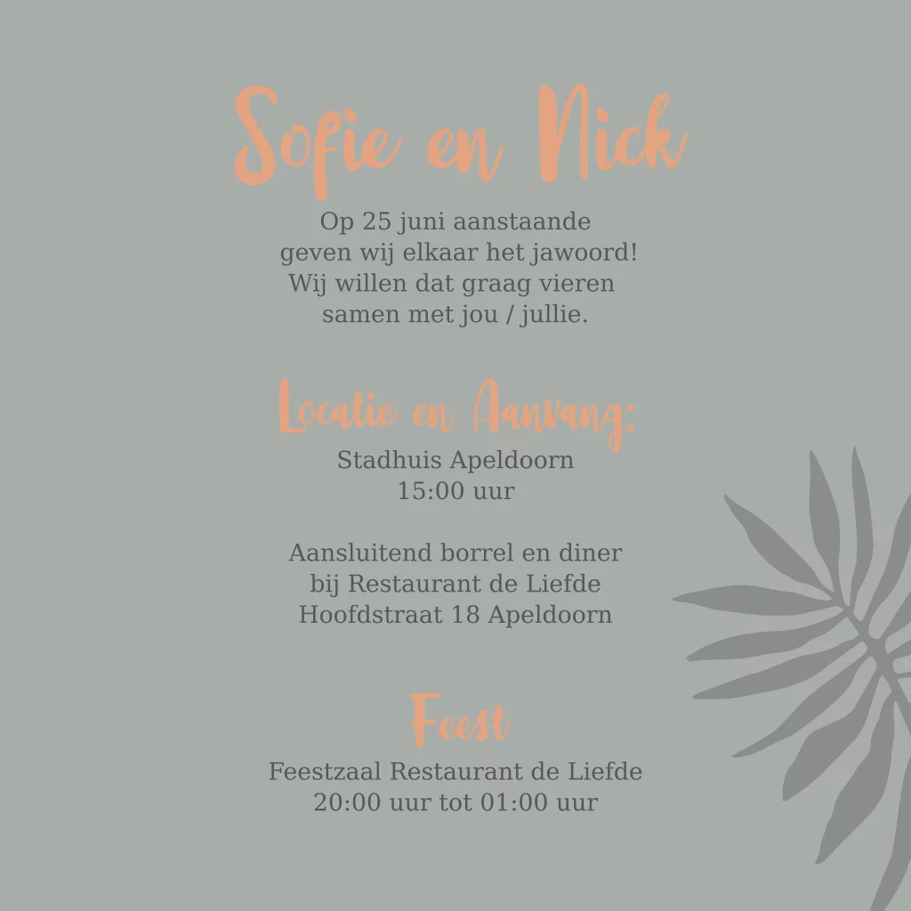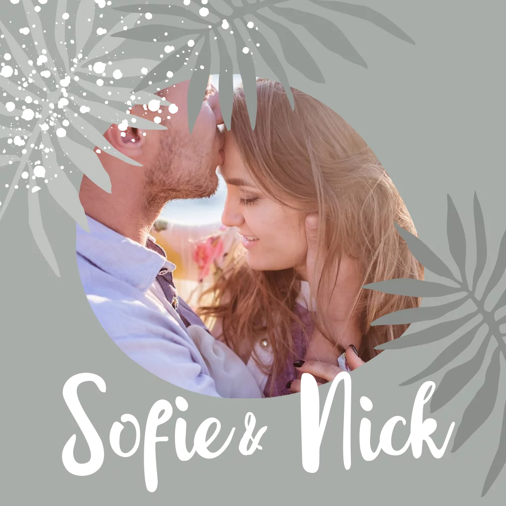 Een stijlvolle trouwkaart met foto, rosé goud folie en palmbladeren. Vervang zelf de foto en pas de teksten aan. Alle kleuren kunnen worden aangepast. (22338)