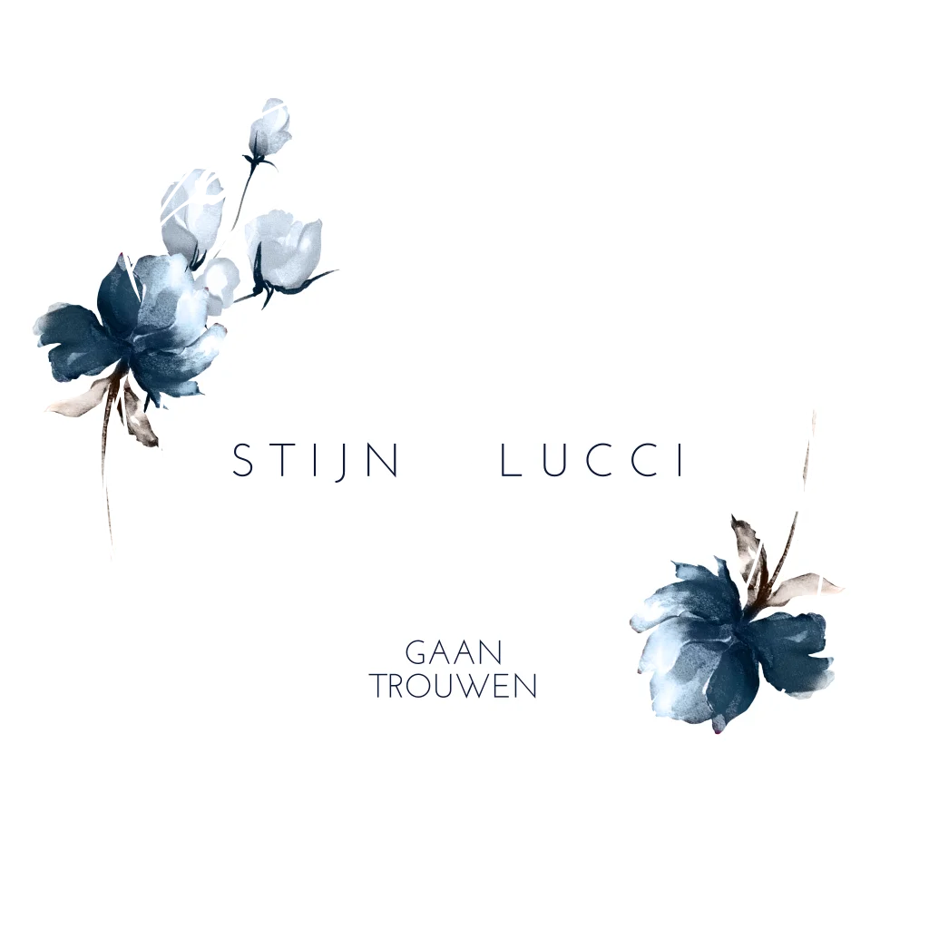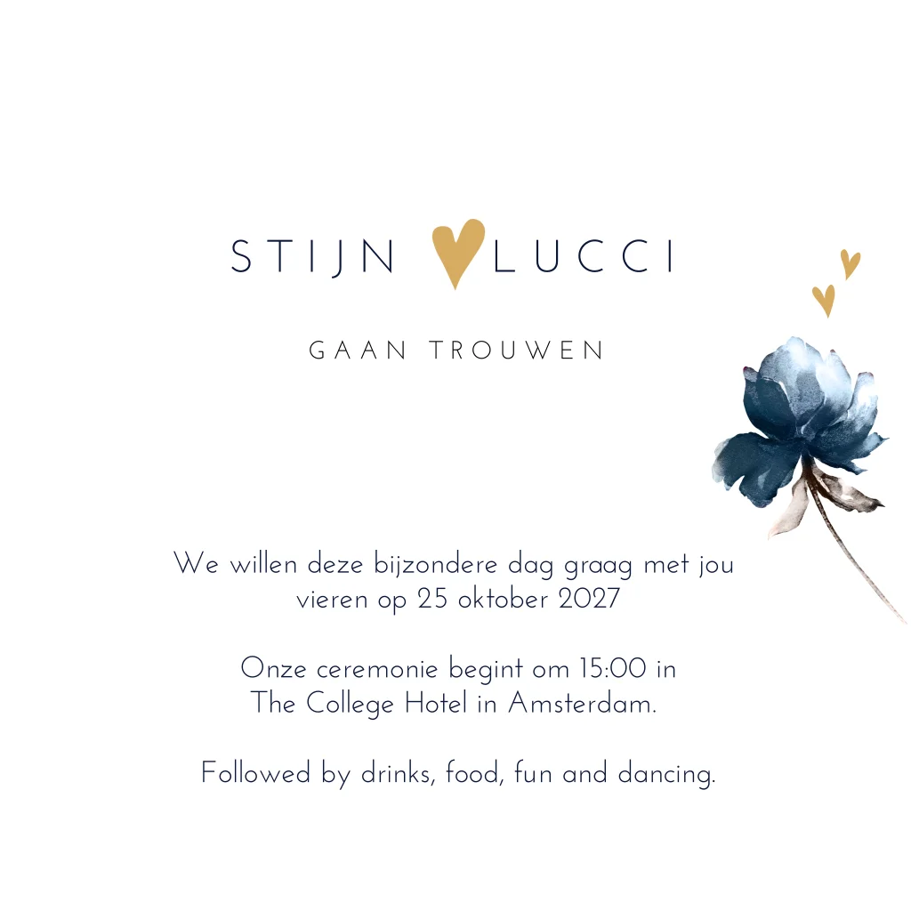 Trouwkaart met goudfolie. Het design is een mooie krans van goudfolie ringen en geschilderde bloemen in de kleur blauw. (22511)