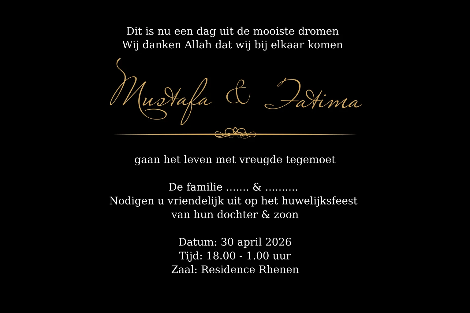 Maak deze fraaie arabische huwelijks uitnodiging met goudfolie elementen en pas eenvoudig de achtergrond kleur aan naar jullie wensen. (8509)
