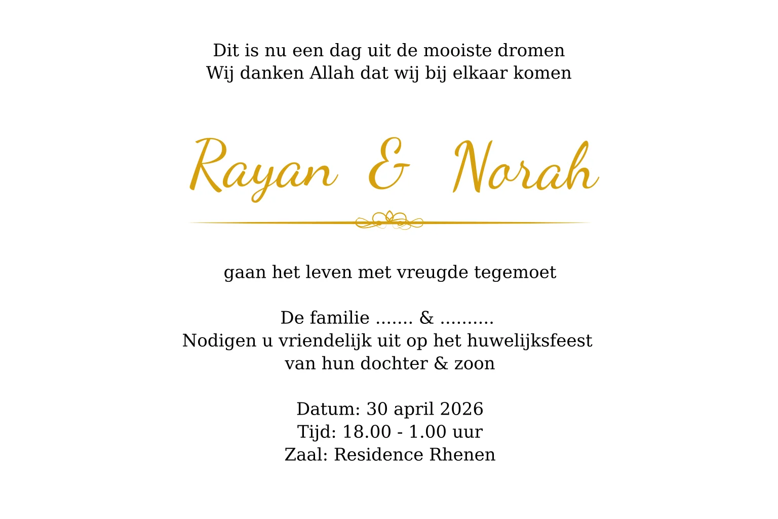 Maak deze fraaie huwelijks uitnodiging in arabische / islamitische sferen met goudfolie elementen en pas eenvoudig de achtergrond kleur aan naar jullie wensen. (8509)let op: het kan zijn dat de lijntjes goud niet helemaal tot de rand lopen, dit is helaas niet altijd doorlopend te krijgen met foliedruk.