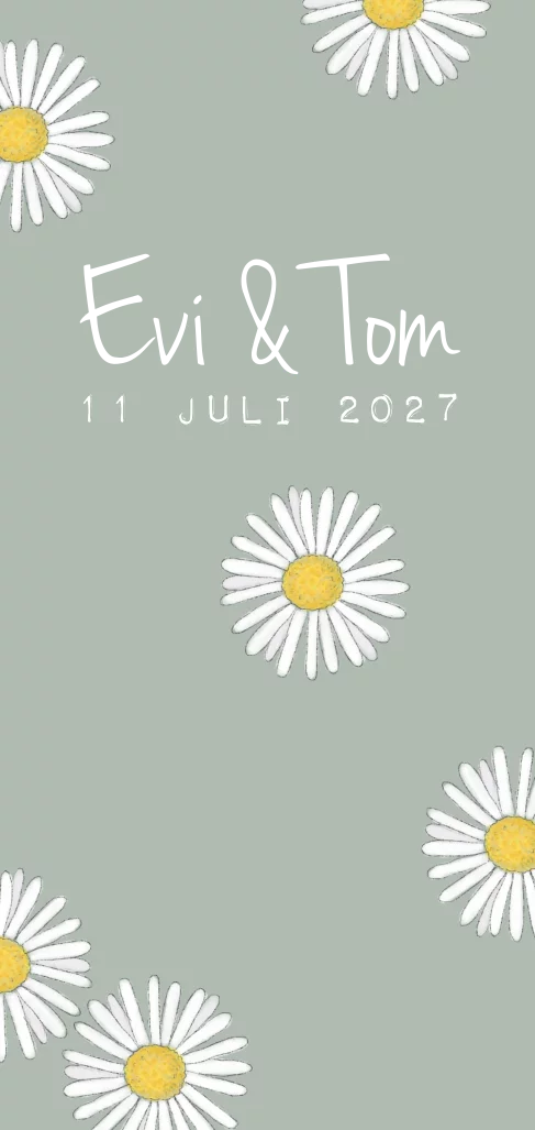Een mooie zomerse trouwkaart met madeliefjes op groen. De namen staan gedrukt in goudfolie. (22296)