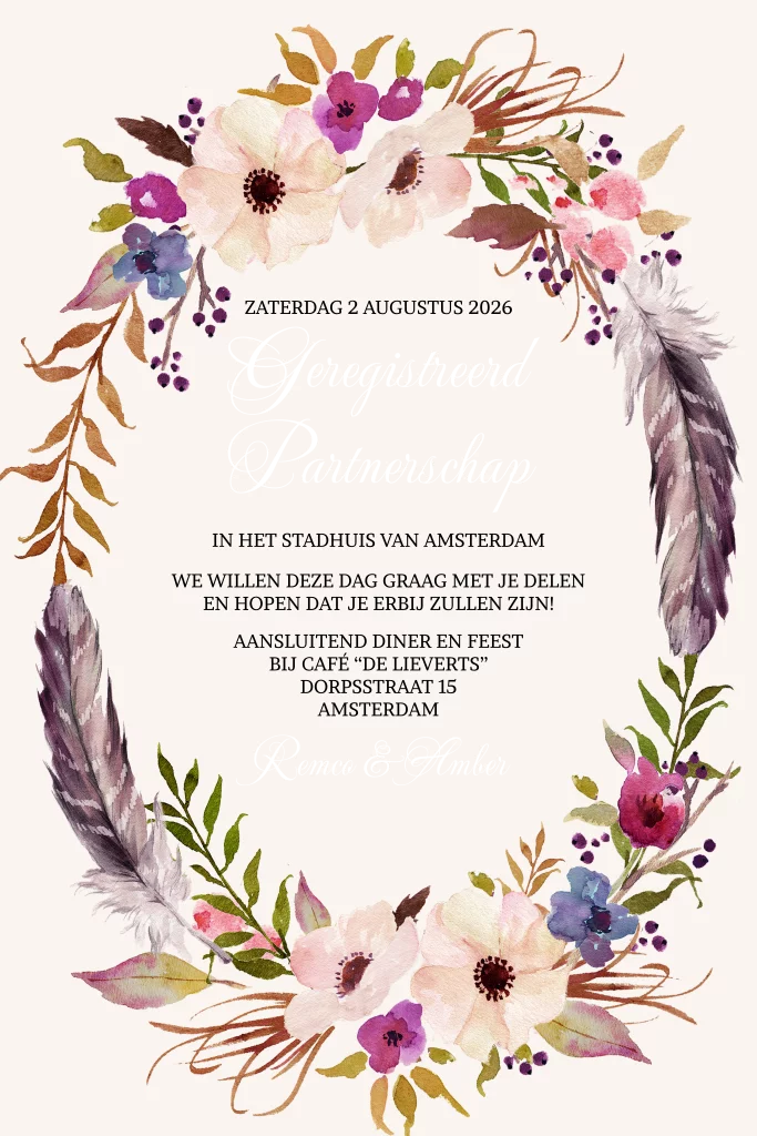 Stijlvolle bohemian foliedruk Geregistreerd partnerschap met een krans van bloemen en veren voor een bruiloft met als thema boho chic. (8557)