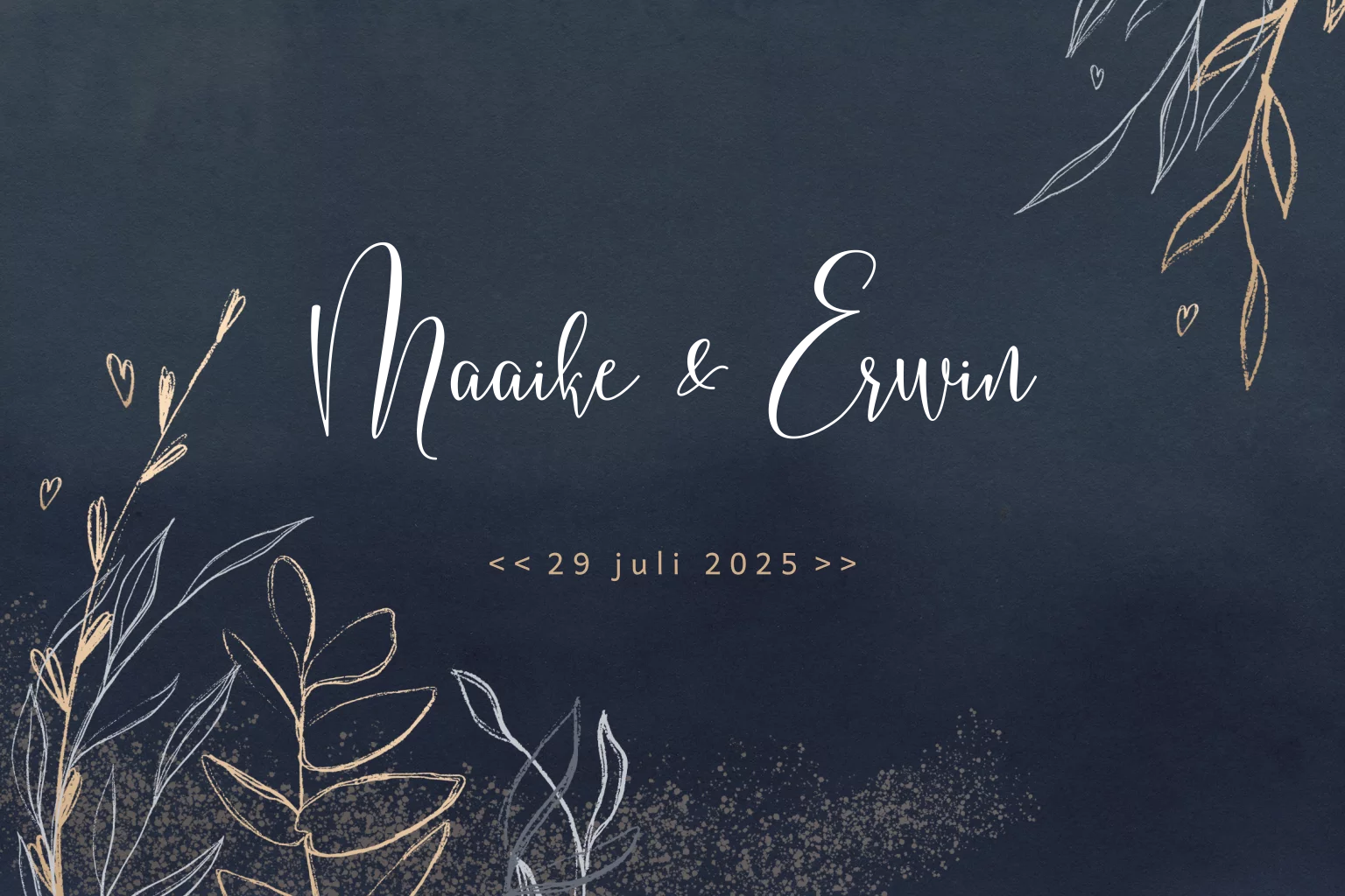 Moderne trouwkaart in de kleur donkerblauw met takjes en bladeren met zilverfolie. (20745)