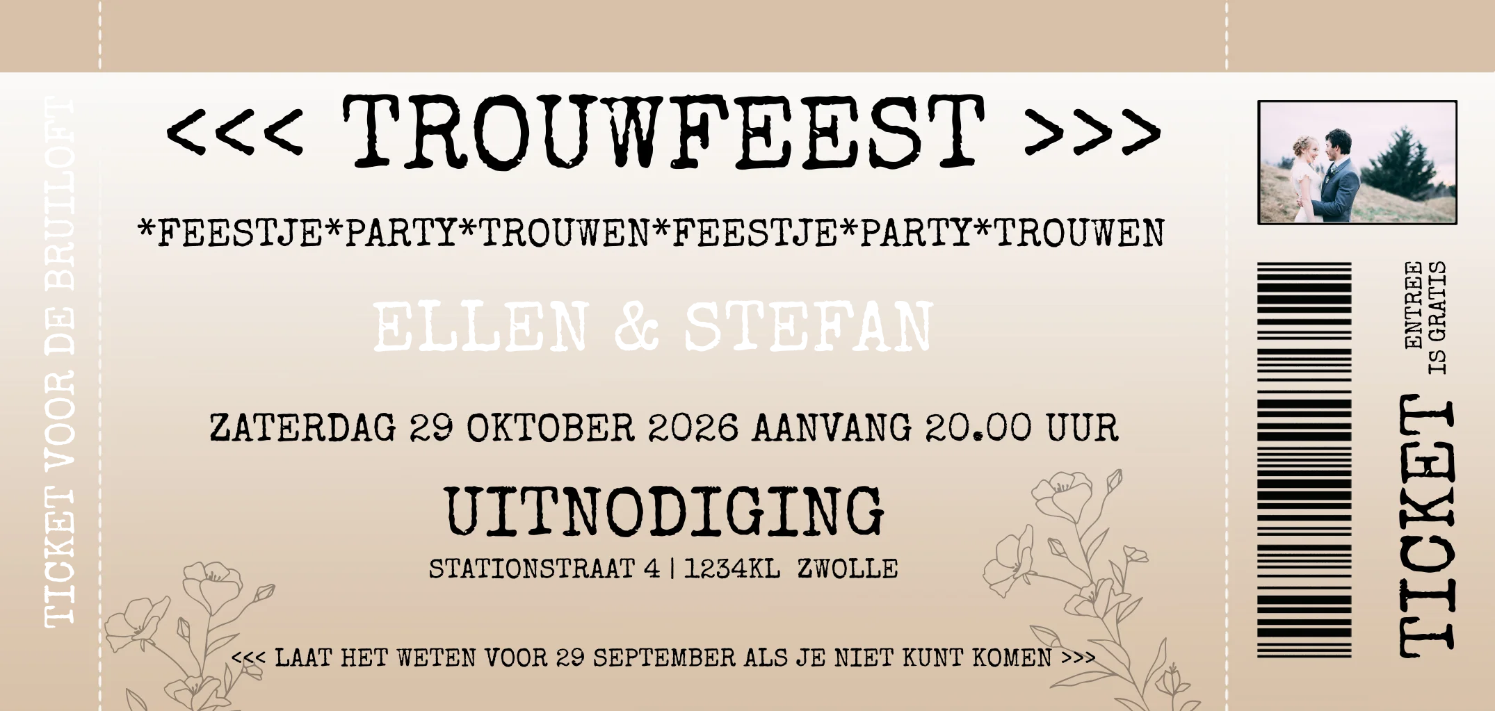 Hippe trouwkaart ticket stijl met goudfolie