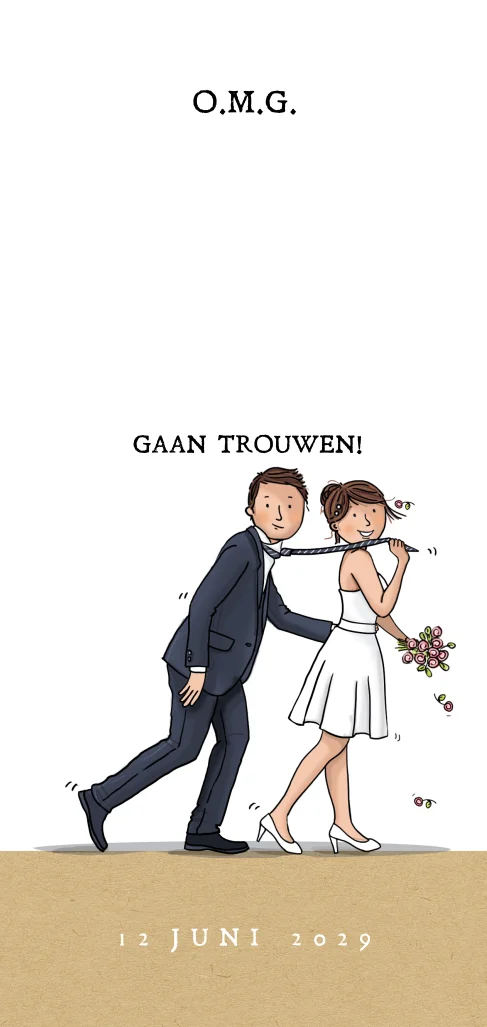 Langwerpige staande trouwkaart bruidspaar stropdas met foliedruk. (20751) Willen jullie de tekening aangepast hebben zodat het meer op jullie lijkt? Vaak is dat mogelijk, neem daarvoor contact met ons op.