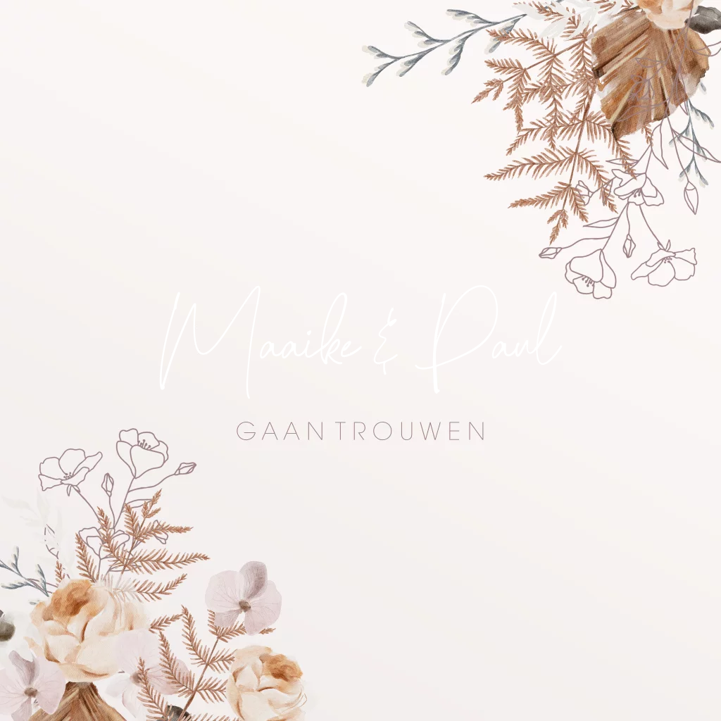 Trouwkaart met handgetekende takjes en gedroogde bloemen op de voorkant. De namen staan in foliedruk. (22420)