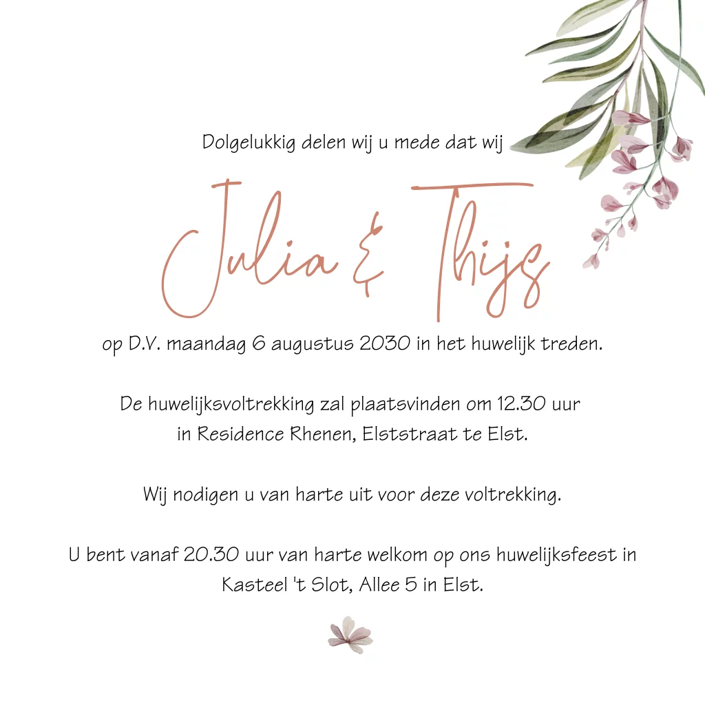 Stijlvolle trendy trouwkaart prachtige bloemen en takjes foliedruk